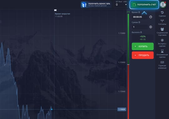 После этого вы переходите к текущей рыночной ситуации по выбранному активу. Добавьте на график необходимые индикаторы, включите сигналы и построения, для использования технического анализа рынка. Сделайте свой прогноз и разместите ордер с помощью торговой панели. Вы всегда можете отслеживать и контролировать вашу торговую сессию в меню Сделки.